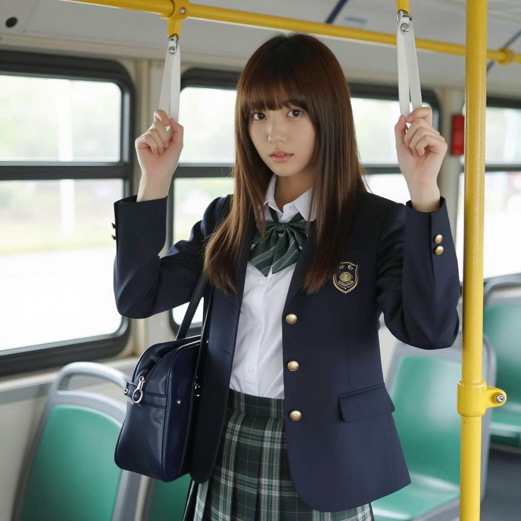 Young Asian woman with straight brown hair and bangs, standing in a bus, holding onto white straps. She wears a navy blue school blazer with gold buttons, white shirt, and green plaid skirt. Black shoulder bag hangs by her side. Green seat in background, bright daylight through windows. Photographic image.