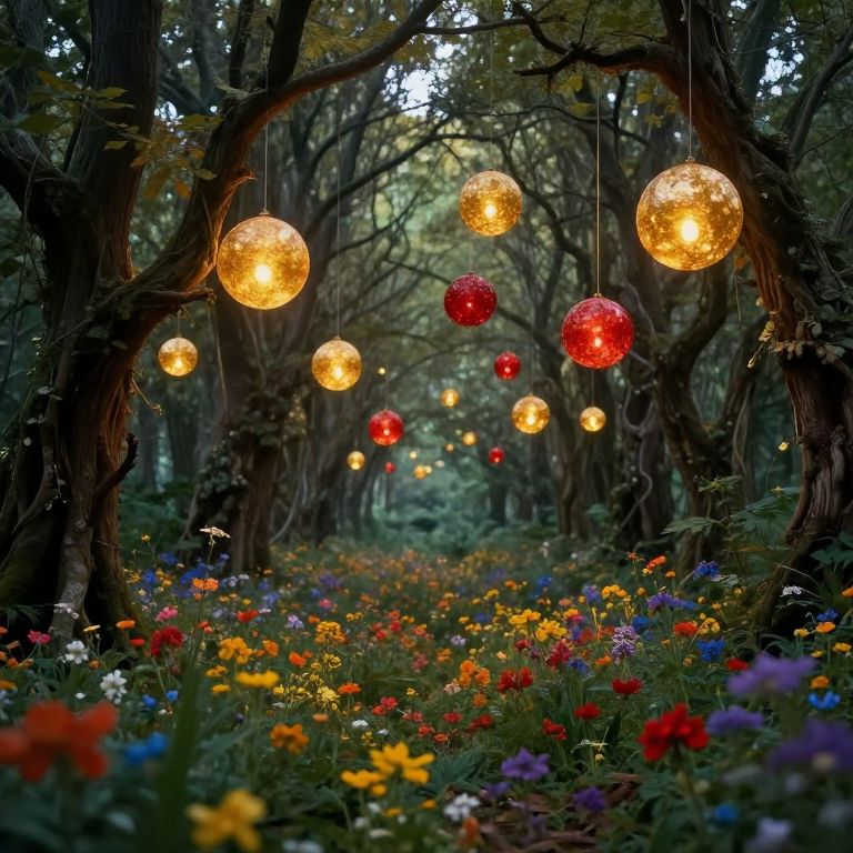 Photograph of a magical forest path adorned with glowing red and yellow spherical lights, flanked by colorful wildflowers and tall, twisted trees.