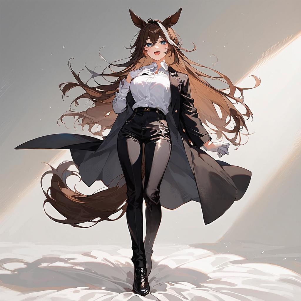 Score_9, score_8_up, score_7_up, source_anime waltz_of_hiwing, 1girl, solo, long hair, looking at viewer, blush, smile, open mouth, bangs, blue eyes, brown hair, shirt, gloves, long sleeves, animal ears, hair between eyes, tail, white shirt, white hair, :d, multicolored hair, teeth, pants, white gloves, signature, two-tone hair, streaked hair, hand on hip, alternate hairstyle, black pants, formal, horse ears, hand on own chest, horse girl, horse tail, full body, standing, leather shoes