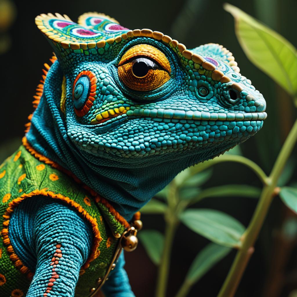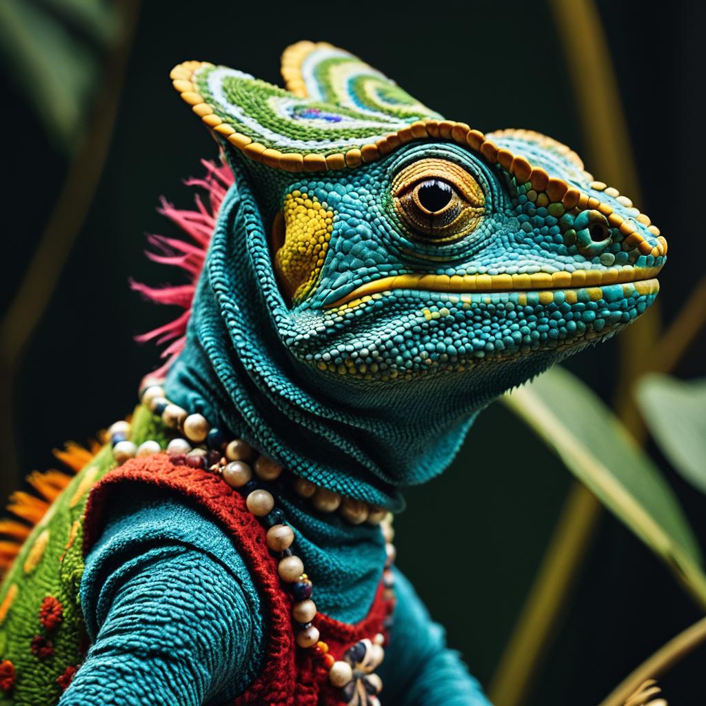 Realistic animal muppet of a chameleon, inspired by Frida Kahlo, photorealistic with surreal psychedelic details, highly intricate, trending on ArtStation, UHD, the rule of thirds, golden ratio, and very intricate details.