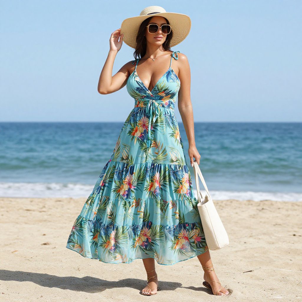 Full body shot, woman, flowing beach cover-up dress, lightweight chiffon fabric, vibrant tropical print, deep V-neckline, adjustable spaghetti straps, cinched waist, tiered ruffle hem, sheer overlay, ankle-length, paired with wide-brimmed straw hat, oversized sunglasses, delicate gold anklet, strappy flat sandals, beach tote bag, sun-kissed skin, ocean backdrop Sexy. Pretty face and beаutiful eyes. Big breasts
