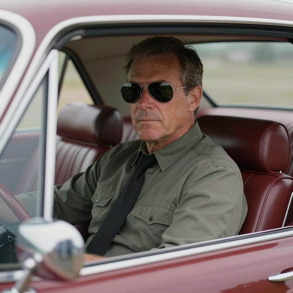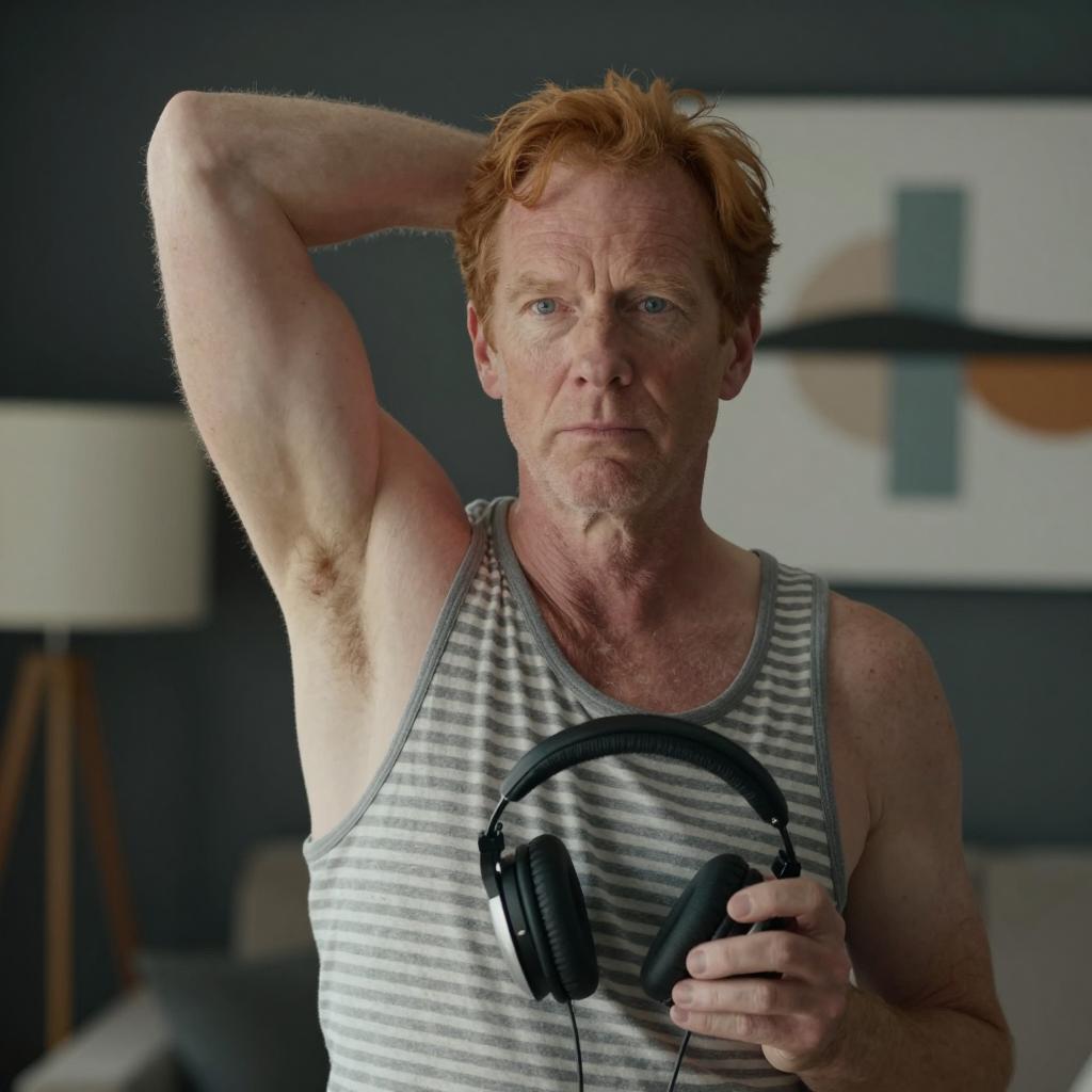 A middle-aged Caucasian man with light brown hair wearing a white t-shirt and blue jeans stands in a dense field of tall green grass. He extends his right arm forward and his left arm backward, displaying a focused expression. The natural outdoor setting emphasizes tranquility and connection with nature.