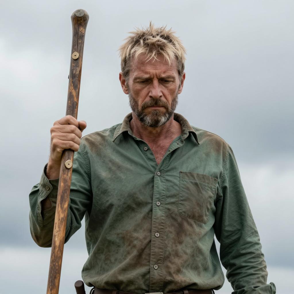 Photograph of a man with light brown hair in a white t-shirt and blue jeans, standing in tall green grass. He extends his right arm forward and his left arm back, with a focused expression. The background is dense with tall grass.
