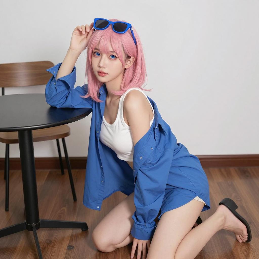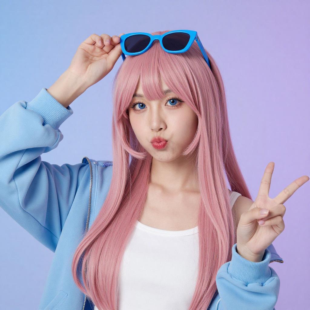 Photograph of a person with pale pink, shoulder-length hair wearing blue reflective sunglasses on their head. They have red lipstick, blue eyes, and are dressed in a white tank top with a gray jacket. The background is a gradient of blue and gray. The person is looking slightly downward with a neutral expression.