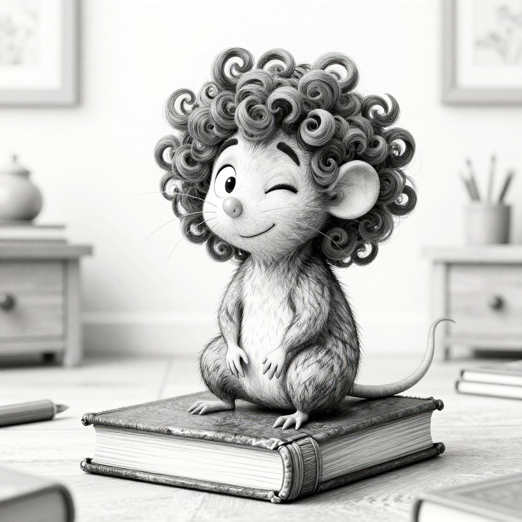 A black-and-white digital drawing depicts a cute, cartoon-style mouse with curly, voluminous hair, standing on a thick, hardcover book. The mouse has large, expressive eyes, one of which is winking, and a small, cheerful smile. Its fur is detailed with fine lines, giving a textured appearance. The background is blurred but suggests a cozy indoor setting with furniture, including a dresser and a window with light streaming in. The mouse's tail curls gently around the book's edge, adding a sense of playfulness to the image. The overall style is whimsical and charming.