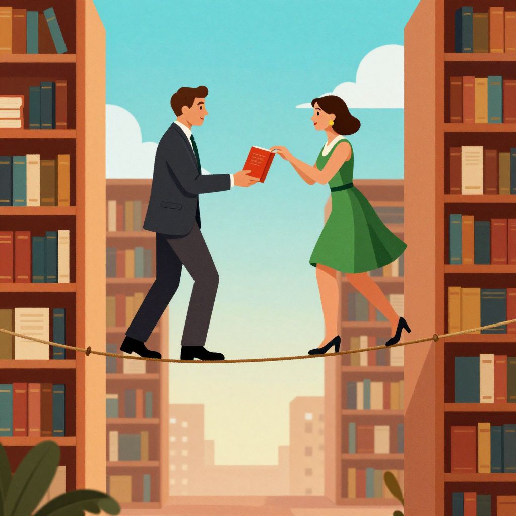 In a vibrant digital illustration reminiscent of mid-century modern art, a man in a suit and a woman in a green dress balance precariously on a tightrope stretched between towering bookshelves, exchanging a red book as they navigate the precarious path with careful precision.
