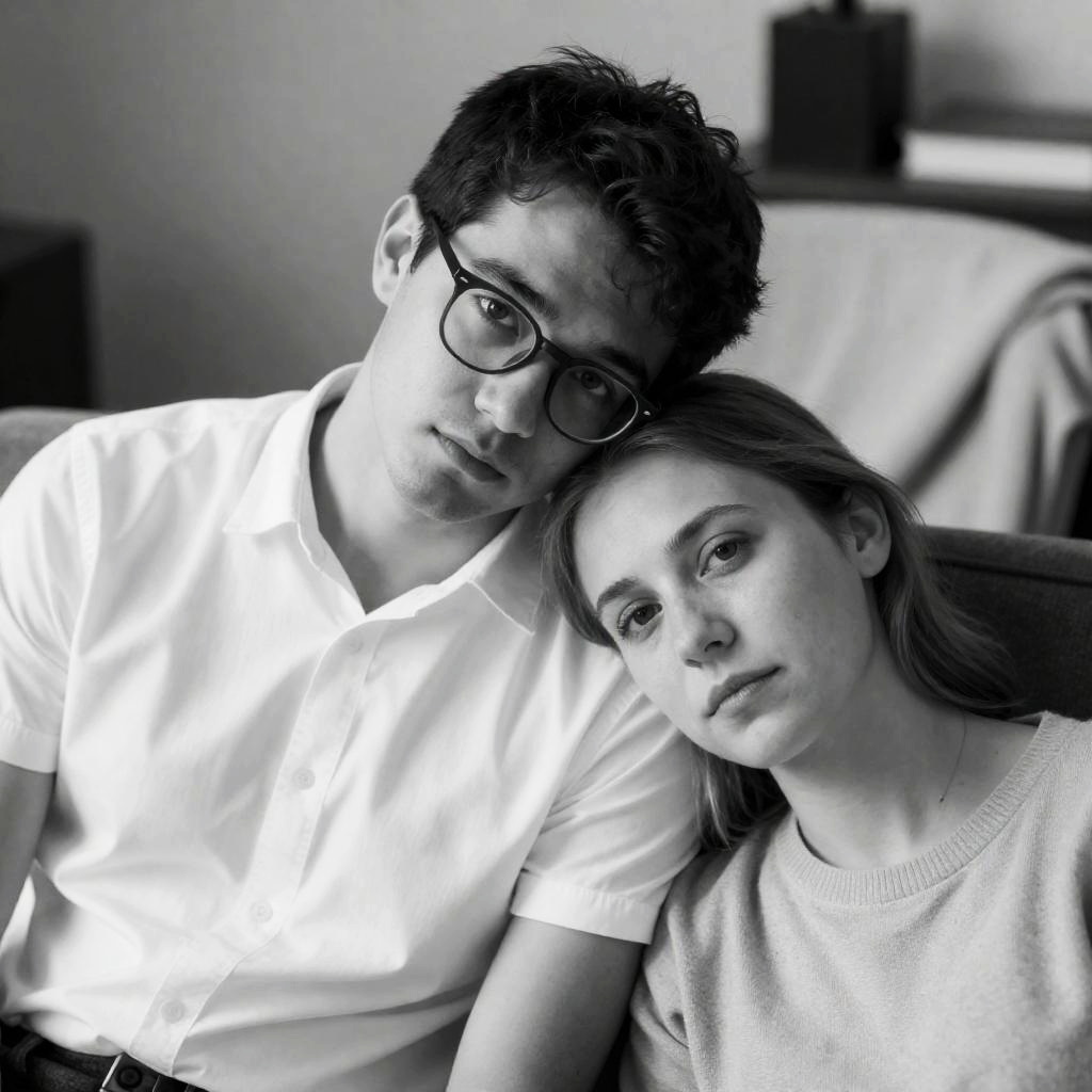 Photograph of two people sitting on a patterned couch. Woman with short red hair, fair skin, black robe, white shirt, looking left. Man with short brown hair, glasses, white t-shirt, blue pants, arms crossed, looking at woman. Couch with gray and beige pattern. Four black-and-white framed pictures on wall behind. Dim lighting.