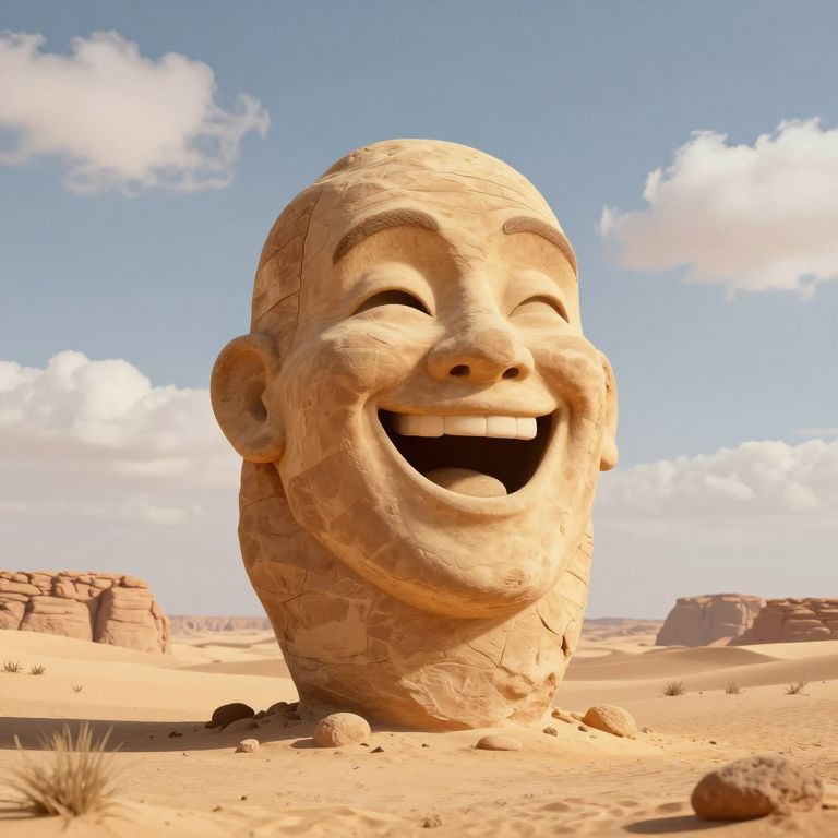 In a whimsical 3D-rendered desert landscape, a towering sandstone formation takes on the exaggerated, cartoonish visage of a laughing figure, its comically oversized head and wide grin defying realism as it stands against a serene sky dotted with fluffy clouds, blending surreal humor with natural beauty.