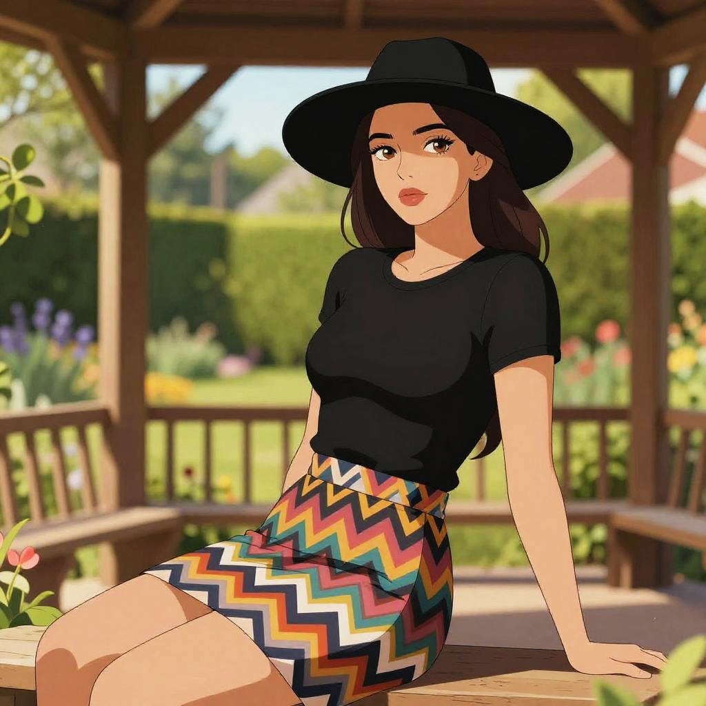A woman, in a contemporary bohemian style, wearing a black crop top with lace-up detail and a floral maxi skirt with thigh-high slits, black heeled sandals, standing in a floral meadow at sunrise, illustrated in the visual style of One Piece. Sexy. Pretty face and beutiful eyes