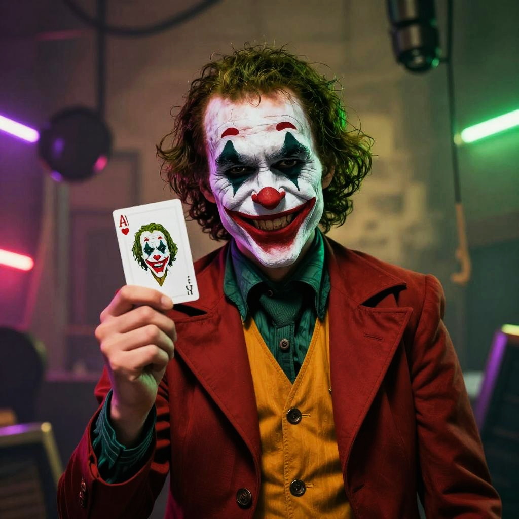 The Joker holding card with a sinister grin, vibrant chaotic background, neon colors, dark shadows, comic book style, highly detailed, dynamic lighting, cinematic atmosphere