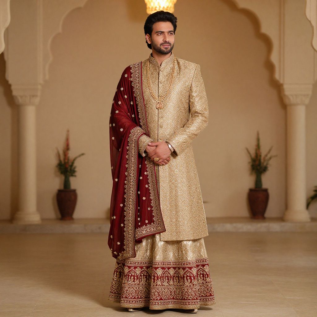"Sherwani Royal Indian Groom Wedding Dress, a man in a red and gold indian wedding outfit"