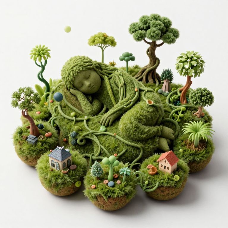 A highly detailed digital artwork depicting a sleeping green Buddha statue surrounded by a lush, miniature forest scene. The Buddha is enveloped in moss, with vines and small trees sprouting from its form. Tiny houses, including a blue one and a red one, sit on moss-covered spheres, each adorned with flowers and plants. Various trees, including a tall, slender one and a bushy one, rise around the Buddha. The background is white, emphasizing the vibrant greenery and colorful elements. The style is surreal and whimsical, blending nature and fantasy elements seamlessly.
