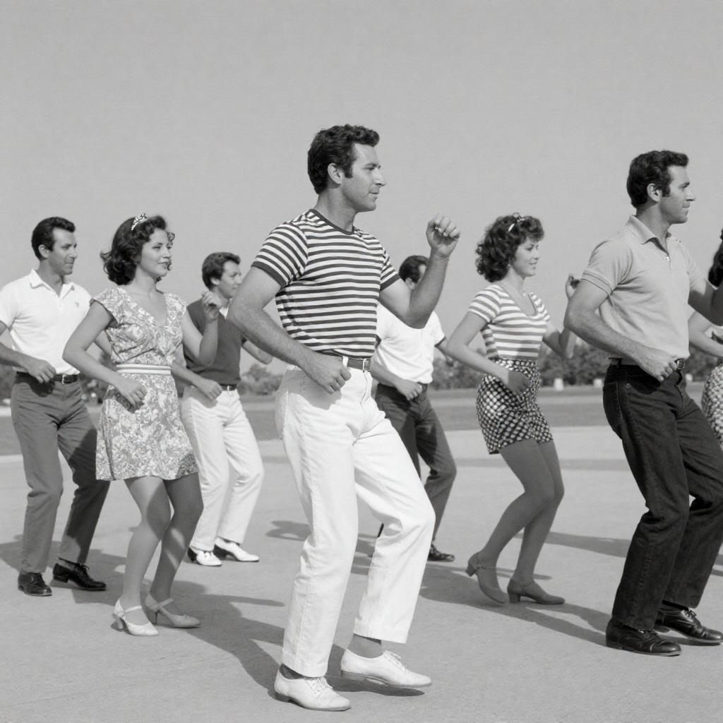 Black-and-white photograph of a group of people dancing outdoors. A man in a striped shirt and white pants dances in the foreground, surrounded by men and women in casual 1970s attire. The background shows a bright, sunny day with clear skies. The dancers are mid-motion, smiling and engaged.