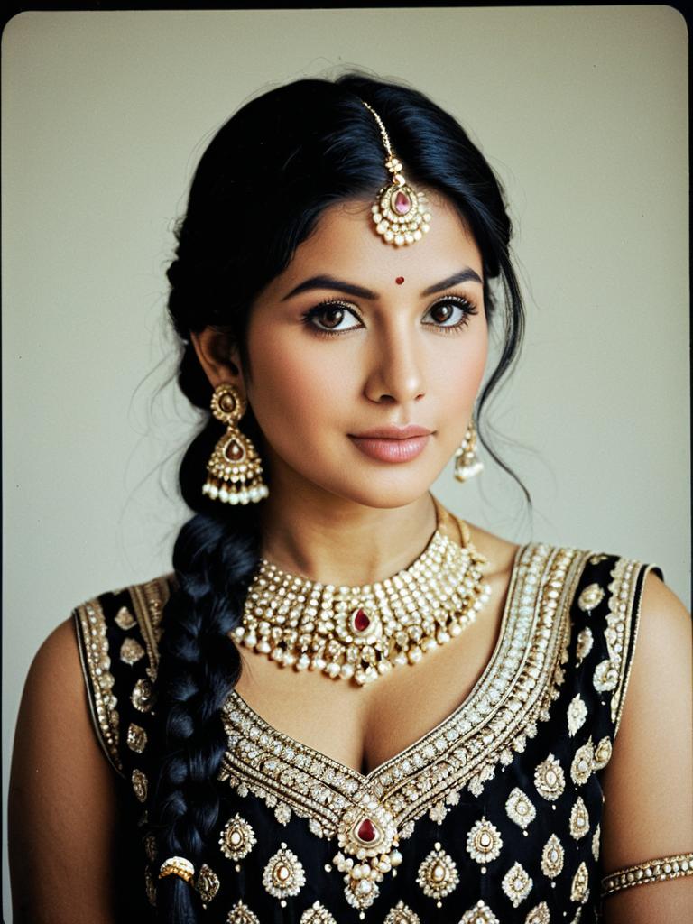 Beautiful indian bridal wear, 1girl, solo, jewelry, earrings, black hair, long hair, realistic, necklace, braid, looking at viewer, upper body, makeup, hair over shoulder