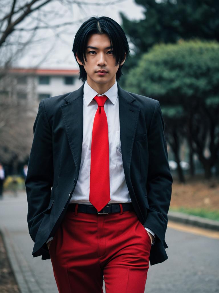 Kakegurui outfit male, 1boy, male focus, solo, necktie, jacket, black hair, outdoors, blurry background, red necktie, shirt, blurry, looking at viewer, pants, realistic, white shirt, collared shirt, red pants, arms behind back, black jacket