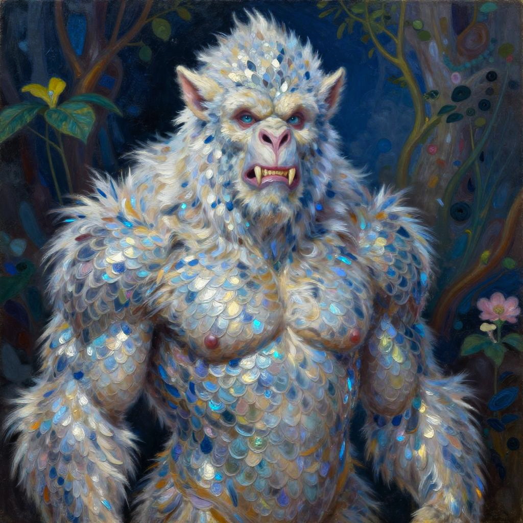 Realistic photo.glamorous yeti woman, glamorous and beastly with shimmering scales, monstrous eyes, and fangs, arctic furry portrait, oil on canvas by Hilma af Klint and Tamara de Lempicka, mystical garden, wonderland of beauty and enchantment realistic photo
