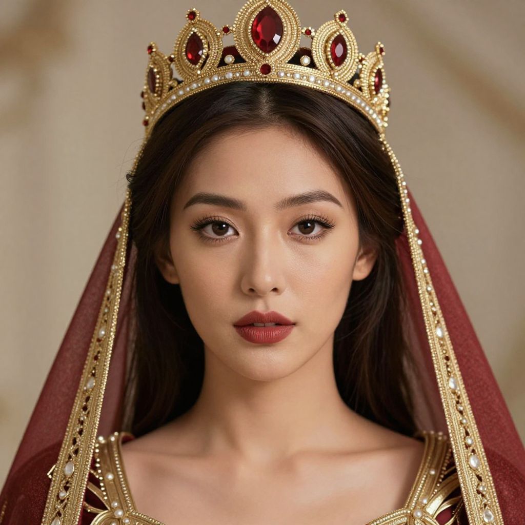 This is a digitally rendered photograph of an East Asian woman with fair skin and long black hair, wearing an ornate gold crown adorned with red gemstones. She has dark, almond-shaped eyes, arched eyebrows, and red lipstick. A maroon veil with gold trim is draped over her head, framing her face. She wears a regal, gold-embellished garment. The background is blurred, featuring soft beige and gold tones, emphasizing her regal appearance. The image has a realistic yet stylized aesthetic, focusing on her calm, composed expression.