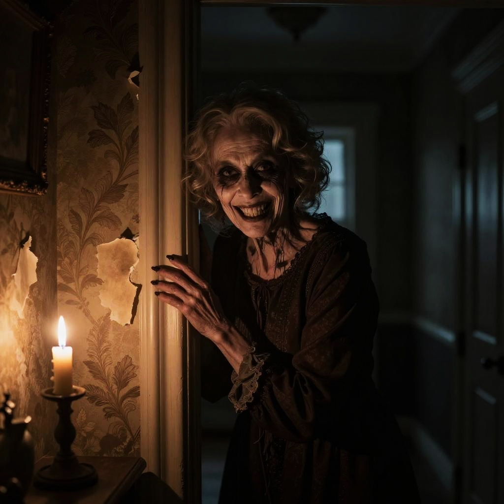 Creepy old lady lurking in shadowy hallway, peeling wallpaper, flickering candlelight casting eerie silhouettes, sinister grin, dark gothic horror style, ultra detailed