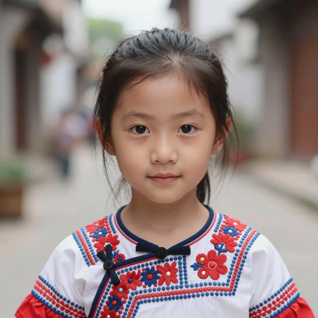 Girl tiana costume, photograph of a young Asian girl, traditional folk costume, yellow and red dress with intricate embroidery, yellow flower headband with red tassel, standing in a narrow street, daytime, sunlight, blurred background with people and traditional wooden buildings, serious expression, clear sky, vibrant colors, realistic, detailed, street festival, cultural attire