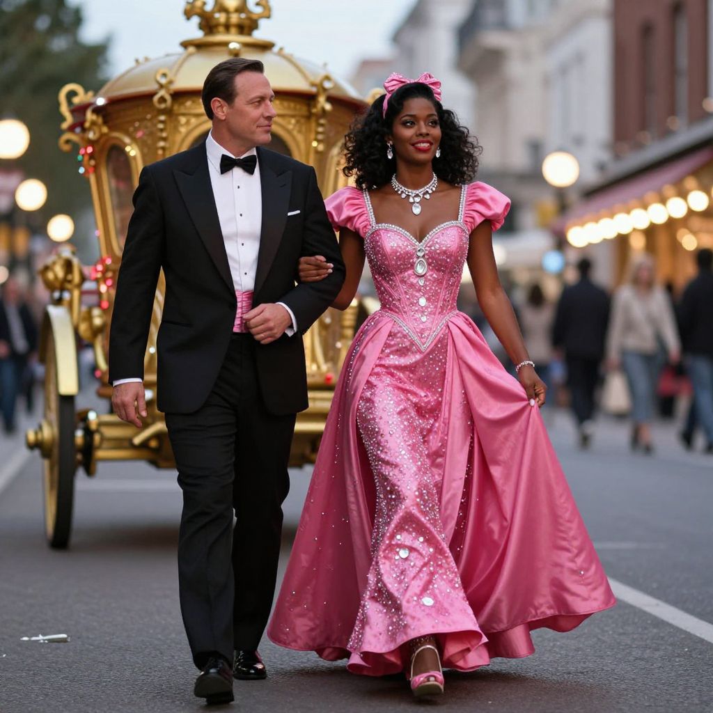 In this vibrant 40k production, a striking woman with dark brown skin and voluminous, curly hair is elegantly dressed in a bold, sparkling pink gown adorned with diamonds, exuding a retro, pin-up style. She is accompanied by a man in a sharp, black tuxedo with a bow tie, both walking arm in arm down a city street at dusk. The scene is illuminated by bright, sparkling lights, casting a warm glow on the couple and the surrounding environment. A golden chariot, waiting in the background, adds a touch of opulence to the scene. The overall composition is dynamic, with the couple positioned centrally, drawing the viewer's eye towards the heart of the image. The interplay of colors, textures, and shapes creates a visually captivating and luxurious atmosphere.