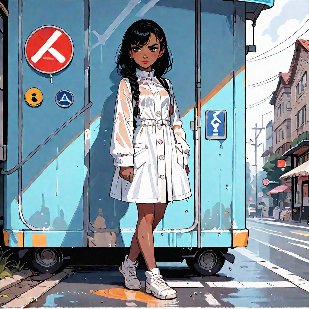 Illustration of an anime-style girl with dark skin, long black braided hair, and red eyes standing at a bus stop on a rainy day. She wears a white raincoat and white sneakers, with a slightly annoyed expression and blush on her cheeks. The background features an old building-lined street, a lamppost, road signs, and wet pavement reflecting the rain.