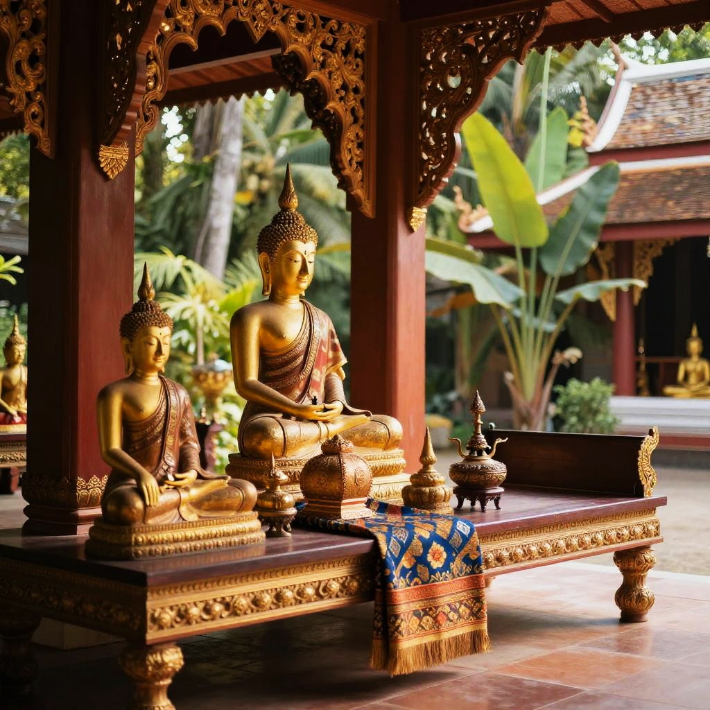 Traditional Thai decor featuring intricate golden wood carvings, vibrant silk textiles, ornate Buddha statues, and elegant low wooden furniture in a serene temple setting with warm natural lighting and lush tropical plants in the background.