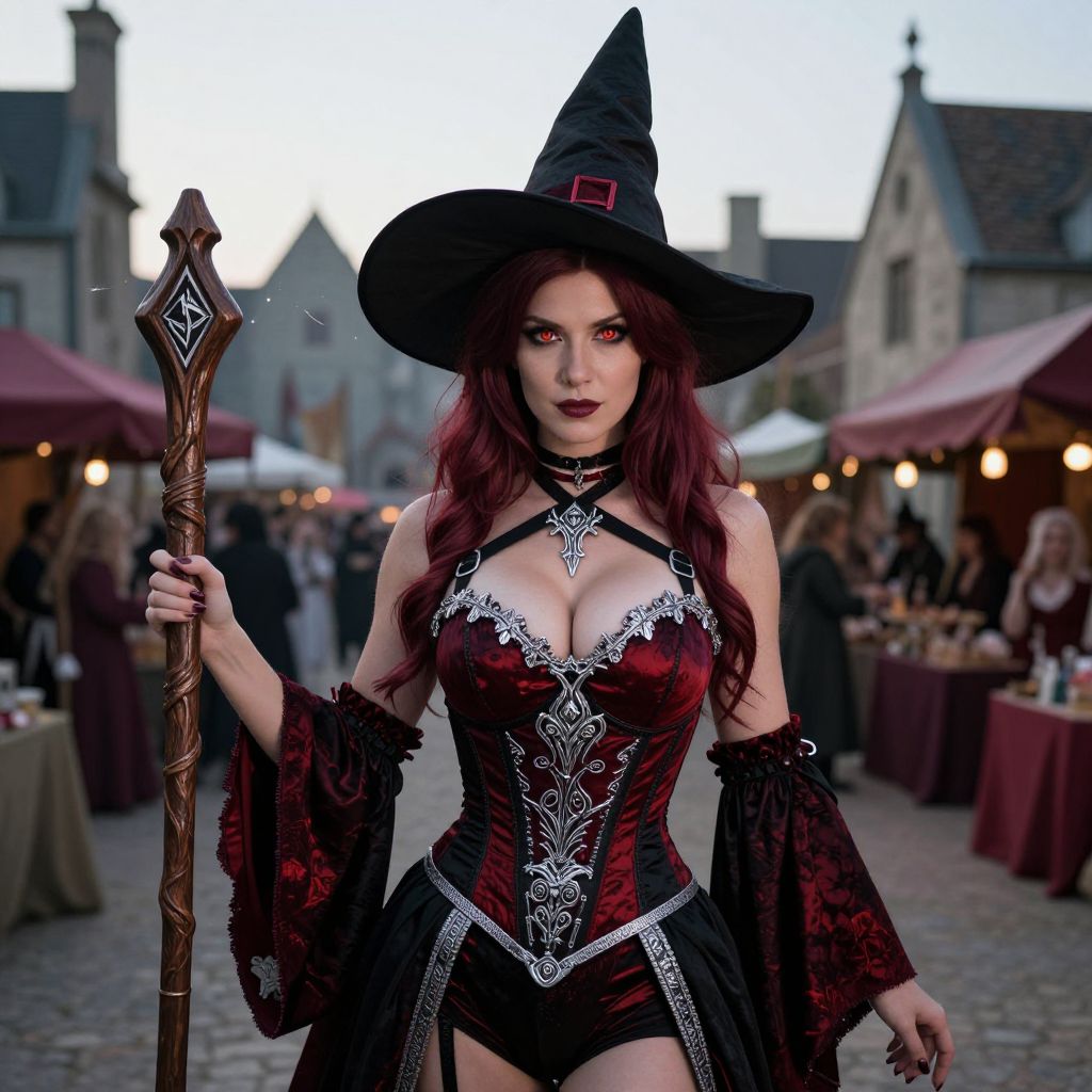 A dramatic, high-contrast photo of a woman with deep red hair and glowing red eyes, dressed in a corset witch costume with intricate silver detailing, a dark red and black corset with wide straps and a tall, crooked pointed hat. She stands dramatically in a medieval marketplace at dawn, surrounded by colorful stalls and people, one hand resting on a wooden staff with a sigil etched on it, casting a subtle magical aura.. The woman has big breasts and cute face