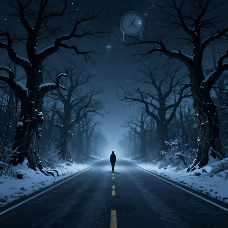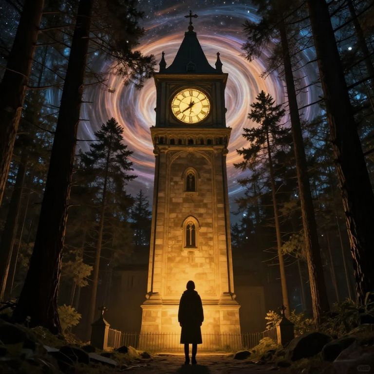 Amidst swirling cosmic light and towering pines, a solitary figure stands before an ancient clock tower, its golden glow casting a timeless warmth that whispers of infinite possibilities and the quiet mystery of existence.