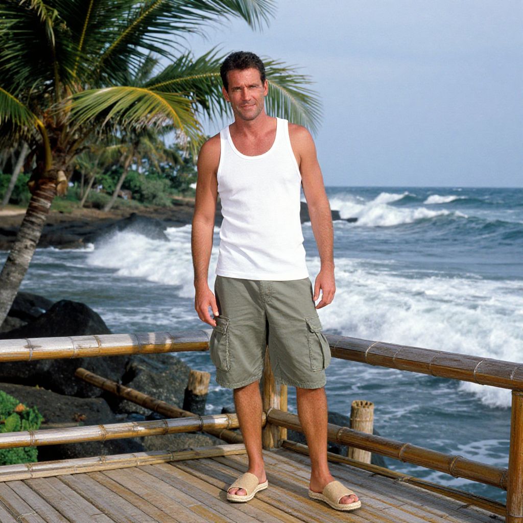 A man, classic white cotton tank top, olive green cargo shorts, tan espadrilles, sun-drenched bamboo deck, ocean waves crashing, lush tropical palms swaying, medium format film, relaxed smile, enjoying the moment. Man has masculine face and piercing eyes
