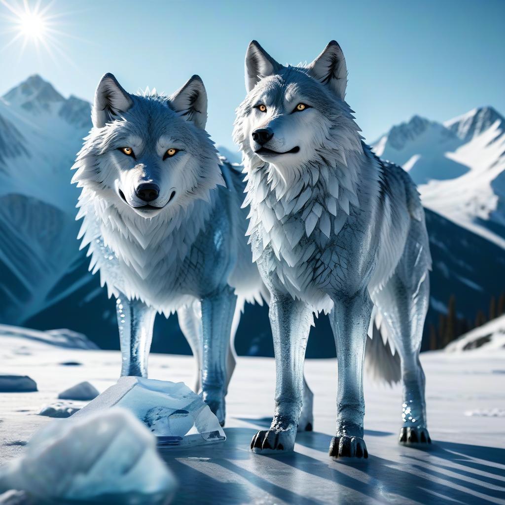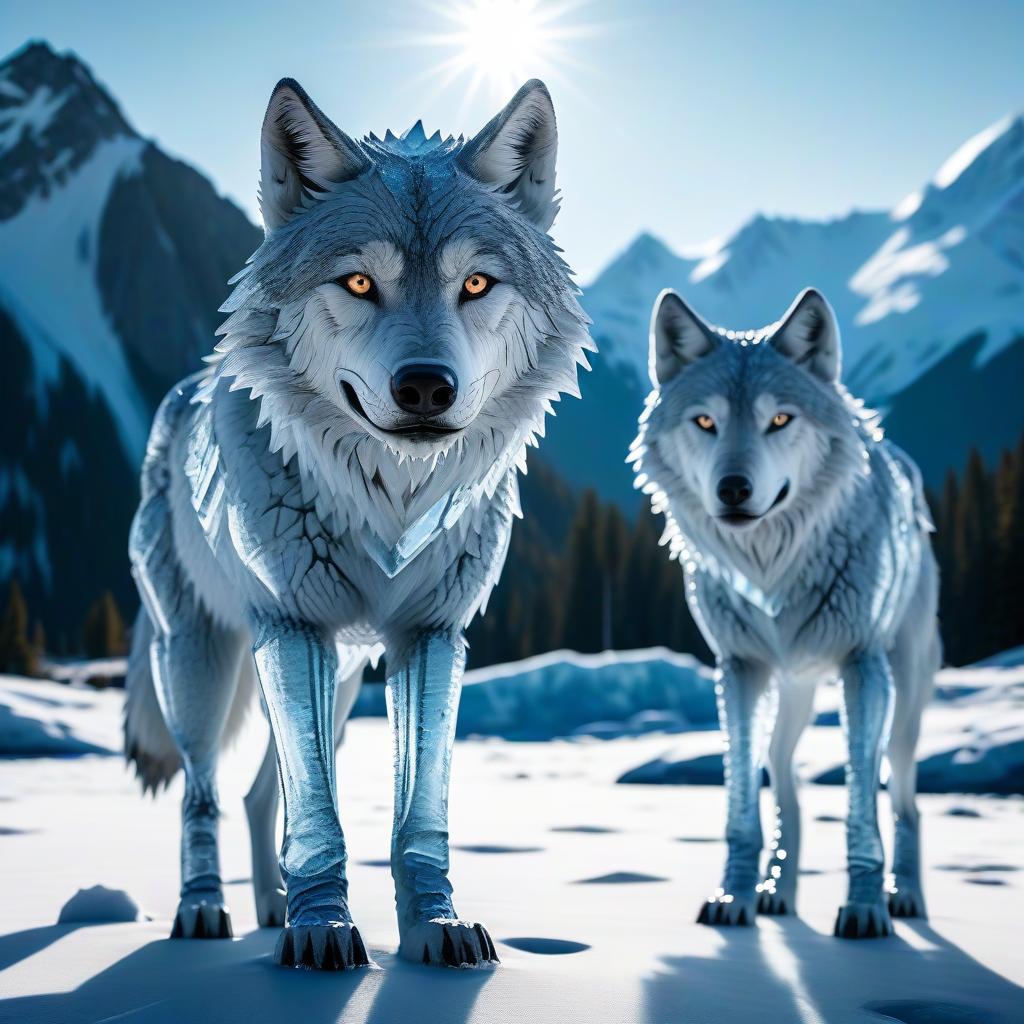 A wolf made of ice sticked together and has come to life. The ice now looks like a real wolf and is 1.5 meters tall, very tall. The ice wolf has an ultra-realistic face. The ice wolf is standing next to a snowy mountain and suspiciously eyes the skiers. The ice glitters beautifully in the sunlight. Real-Life photo shot, full-Body photo, 8K UHD, many details, Award-winning.