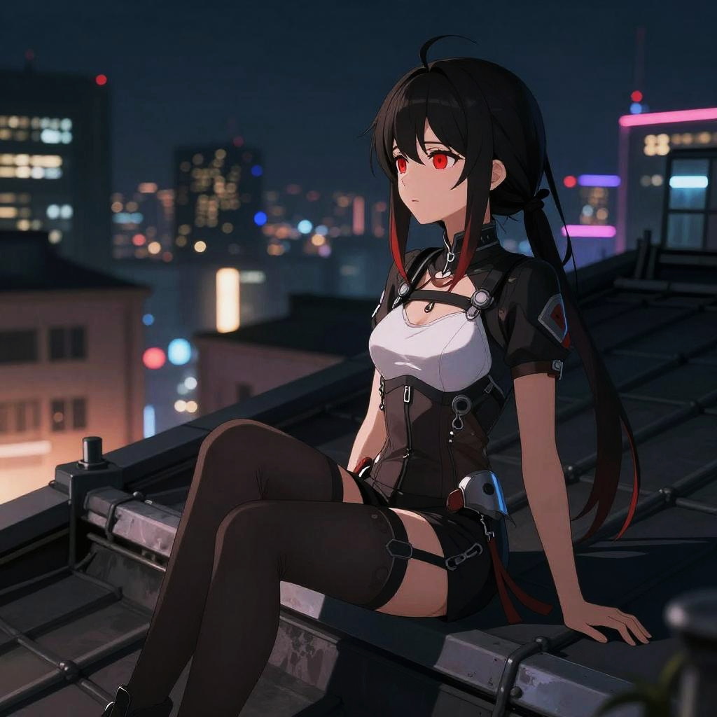 Red eyed anime girl sitting on a vintage rooftop at night, gazing at the neon-lit skyline, wearing a sleek modern outfit with subtle armor elements, ambient lighting casting dramatic shadows, detailed and atmospheric anime scene.