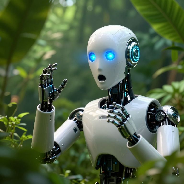 Surprised reaction of a futuristic robot discovering nature, glowing blue eyes, surrounded by lush greenery, high detail, sci-fi aesthetic