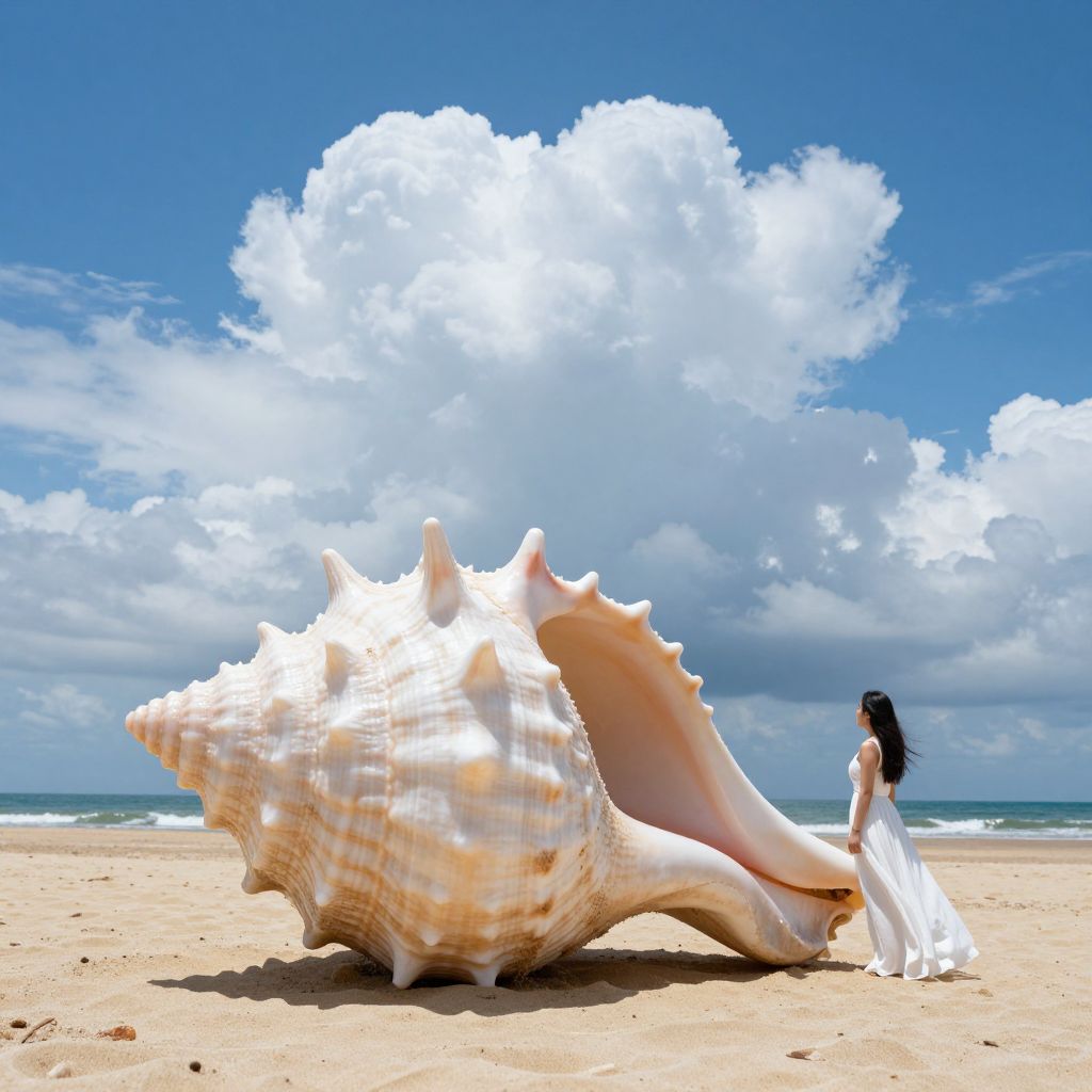 Giant seashell with spiky protrusions stands open on a sandy beach, dwarfing a woman in a flowing white dress as she gazes toward the horizon where massive cumulus clouds loom against a vibrant blue sky.