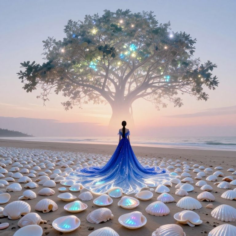 Photograph of a sandy beach under a bright blue sky with white, fluffy clouds. A giant, pale pink and beige seashell with intricate ridges lies on the sand, occupying the left side of the image. A woman with long black hair, wearing a white, sleeveless, flowing dress, stands to the right, gazing at the seashell. The ocean is visible in the background, with gentle waves meeting the shore. The sand is light beige, contrasting with the vivid blue sky and the woman's white dress. The scene is serene and picturesque.
