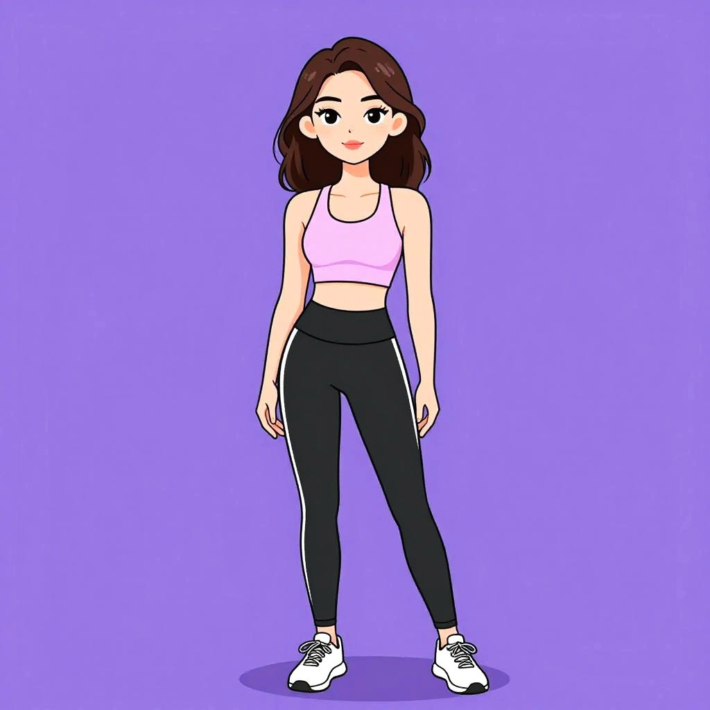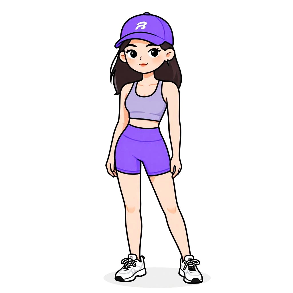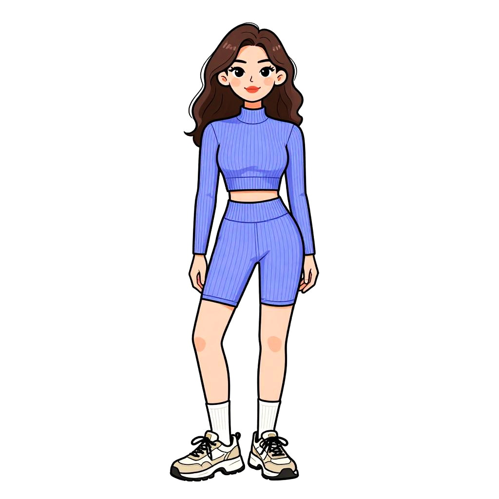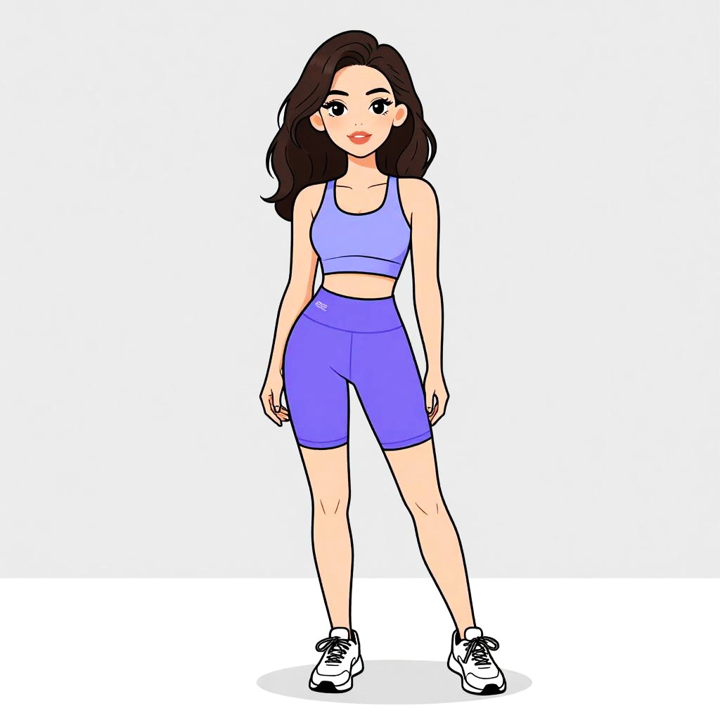 Woman with pretty face and pretty hair. Woman, athletic wear, navy blue sports bra, scoop neckline, racerback, gold accent panels, matching high-waisted compression shorts, gold side stripes, white crew socks, white sneakers, hair in a ponytail, white studio background --sref 1467