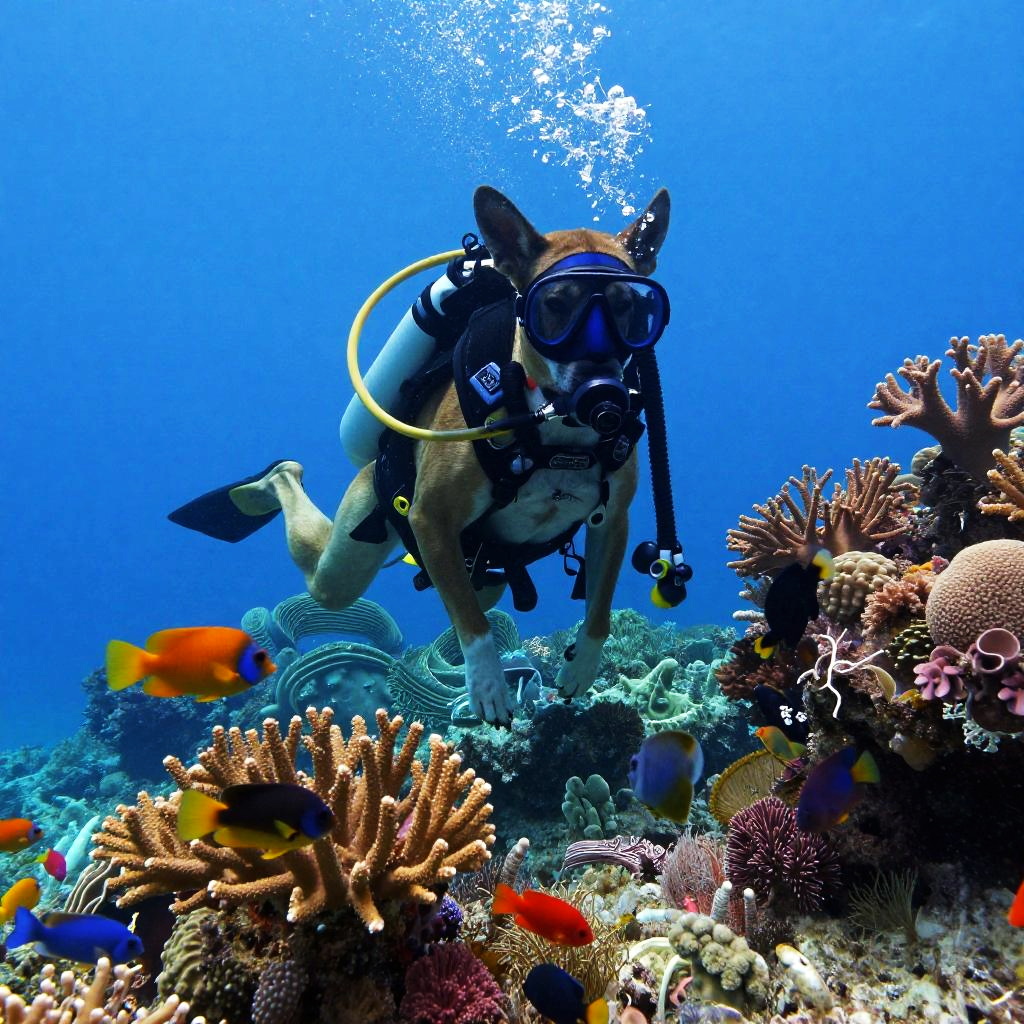 Dog in scuba gear exploring wreck of a sunken ship, mysterious and moody underwater atmosphere, detailed scuba mask and gear on playful dog, deep blue ocean environment, high resolution