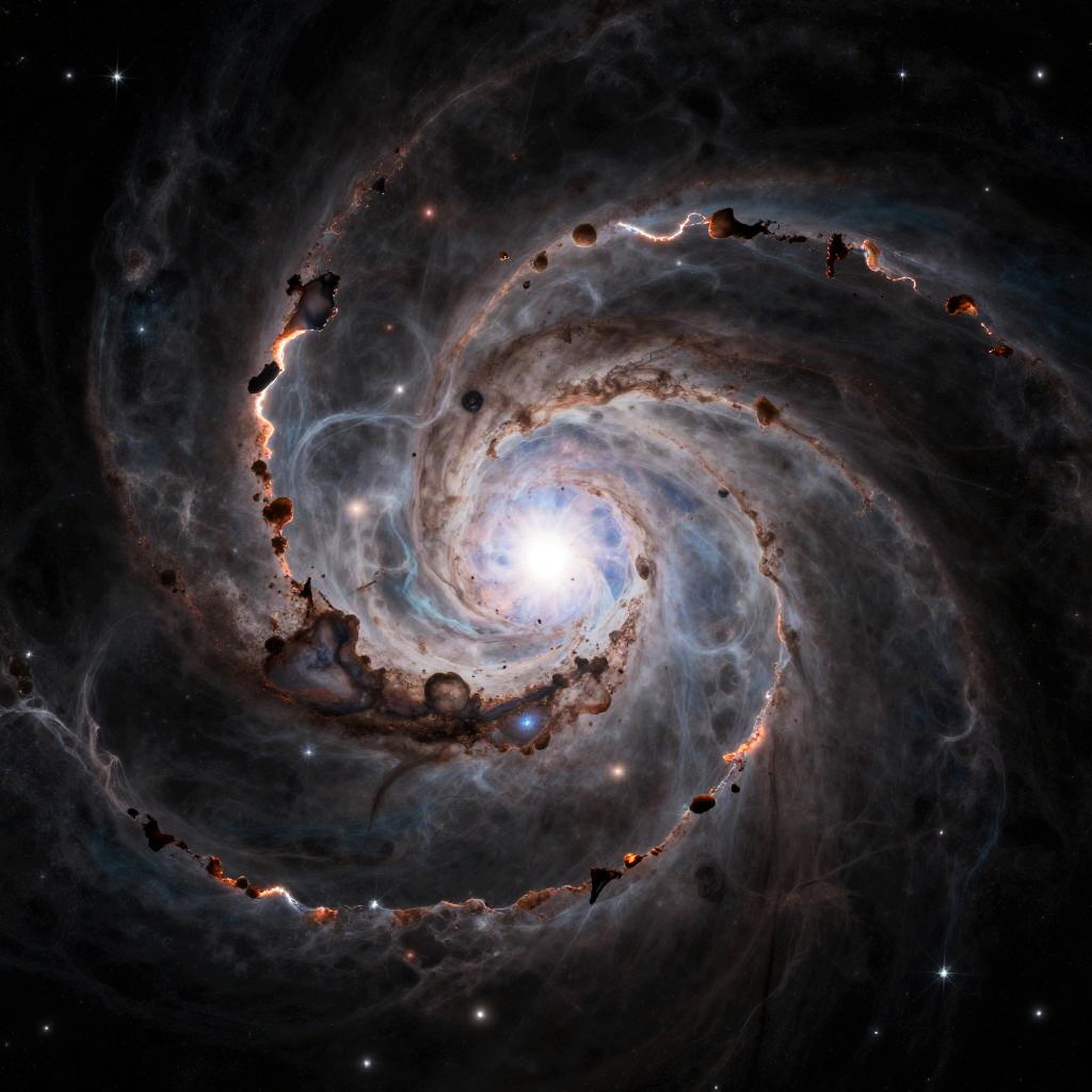 Unstable.diffusion represented as a cosmic nebula with swirling gases and fragmented light beams, stars dissolving into unpredictable patterns, a dreamlike space scene blending realism and abstraction to symbolize unstable energy and diffusion across the universe.