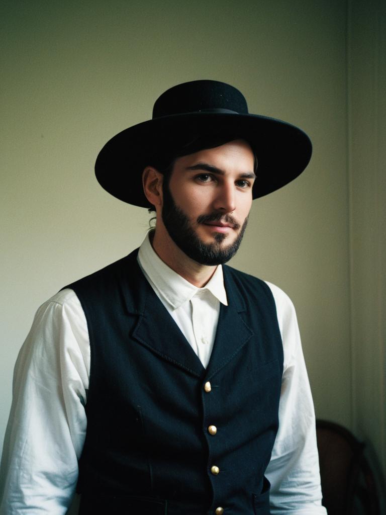 Man in Amish costume, cosplay editorial photography, photorealistic lighting