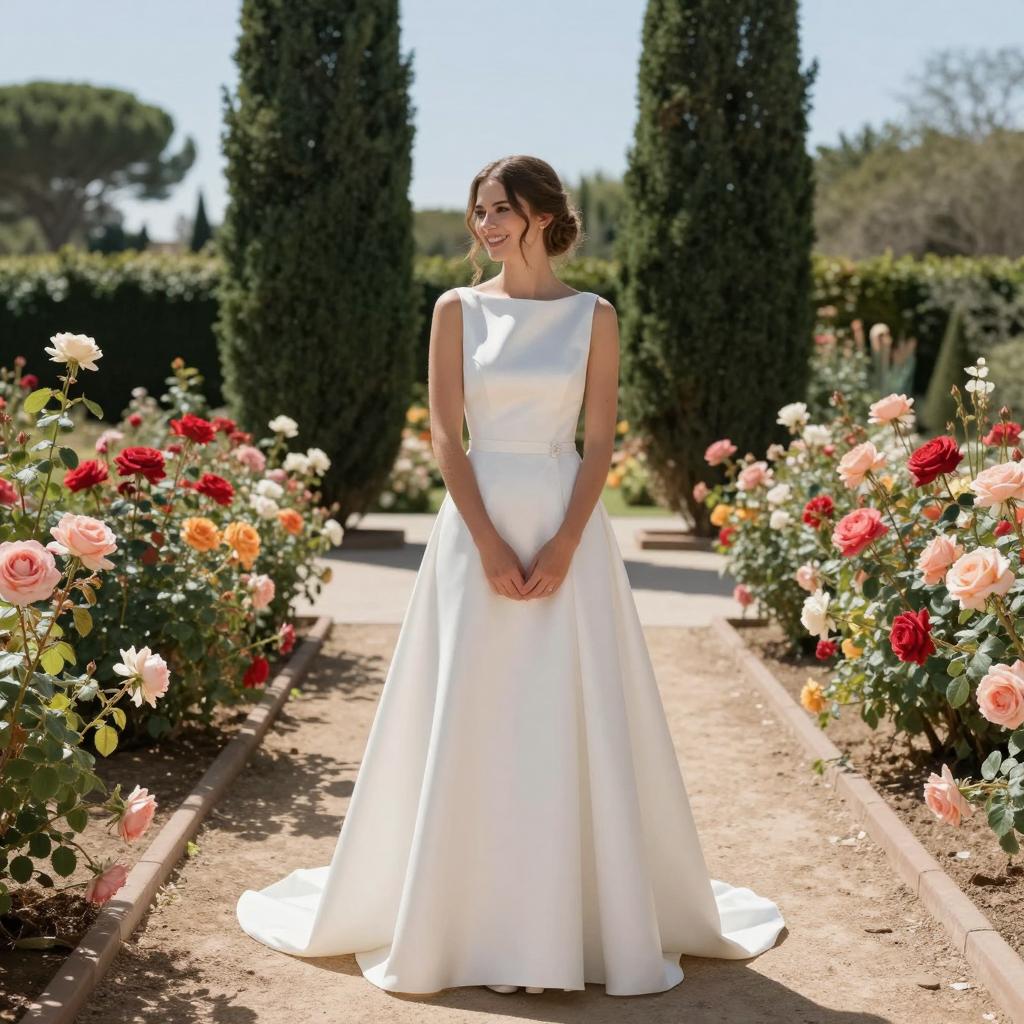Photo of a smiling woman wearing a sleeveless white satin wedding dress standing on a sunlit dirt path in a vibrant rose garden. She has brown hair styled in a loose updo and her hands are clasped in front. The garden features blooming roses in shades of red, pink, peach, and white, flanked by tall dark green cypress trees under a clear blue sky, creating an elegant and romantic atmosphere.