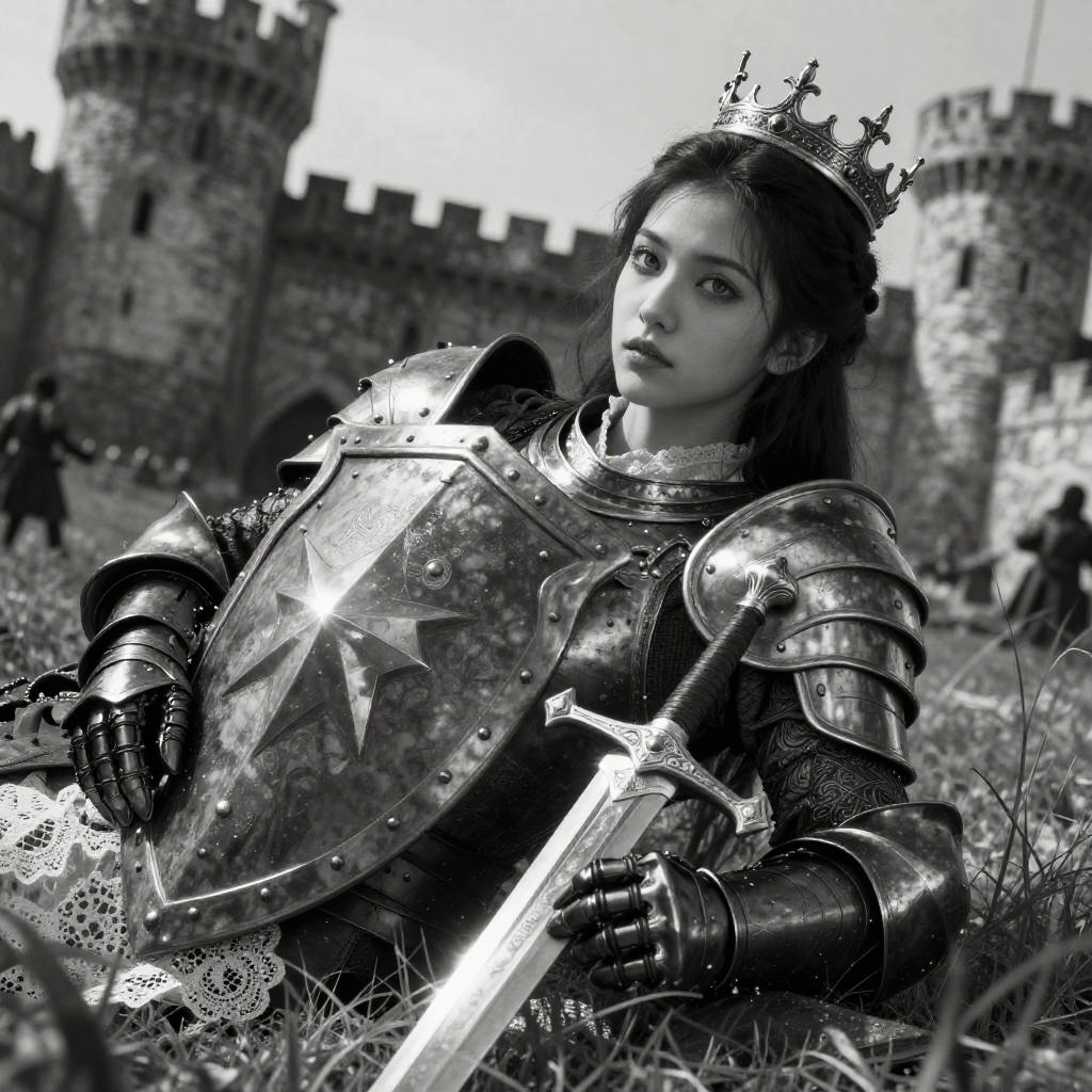 Black and white photograph of a young woman with light skin and dark hair, wearing medieval armor and a crown, lying on grass. She holds a sword in her right hand and a shield with a star emblem in her left. Her expression is serious and focused. In the background, there are tall, stone castle towers with crenellations. The armor is shiny with detailed textures, and the grass is slightly blurred. The image has a dramatic, high-contrast style, emphasizing the heroine's determined look and the historical setting.