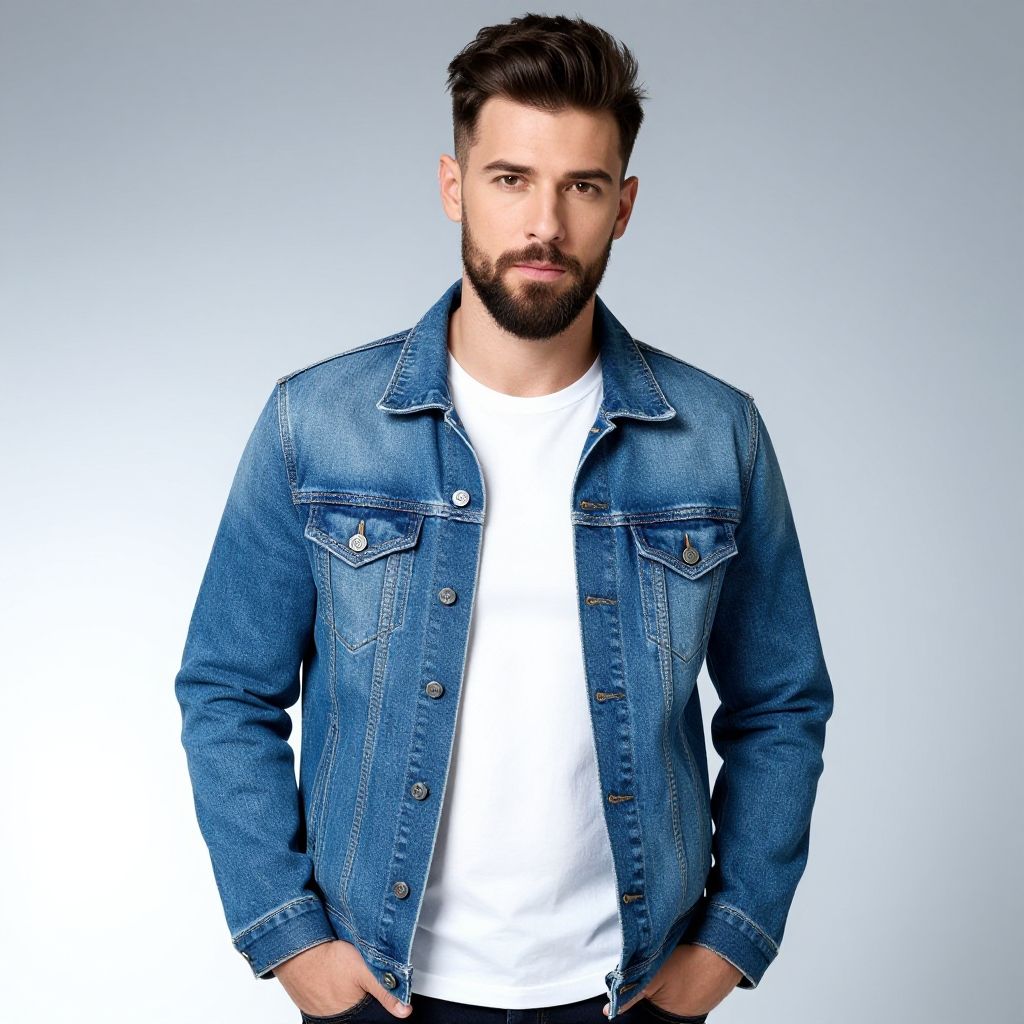 A stylish bearded man poses confidently wearing a classic blue denim jacket over a white t-shirt with his hands partially in his pockets. The modern, clean look is enhanced by a simple, gradient background that highlights his sharp facial features and well-groomed hair.