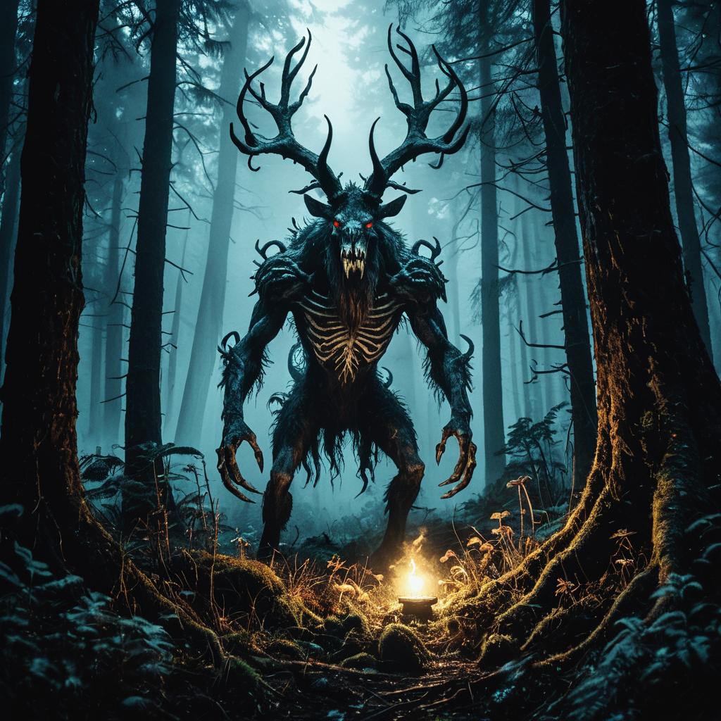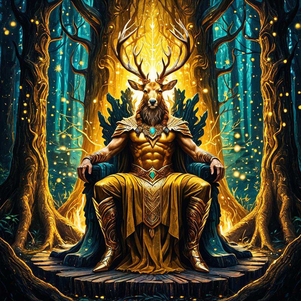 High detail digital artwork of an isolated enchanted forest spirit standing in a misty, dense forest. The spirit has the head of a majestic stag with large antlers and glowing eyes, wearing an intricate robe adorned with soft glowing mystical patterns. The surrounding forest is lush with ferns and moss-covered tree trunks, evoking a magical and mysterious atmosphere.