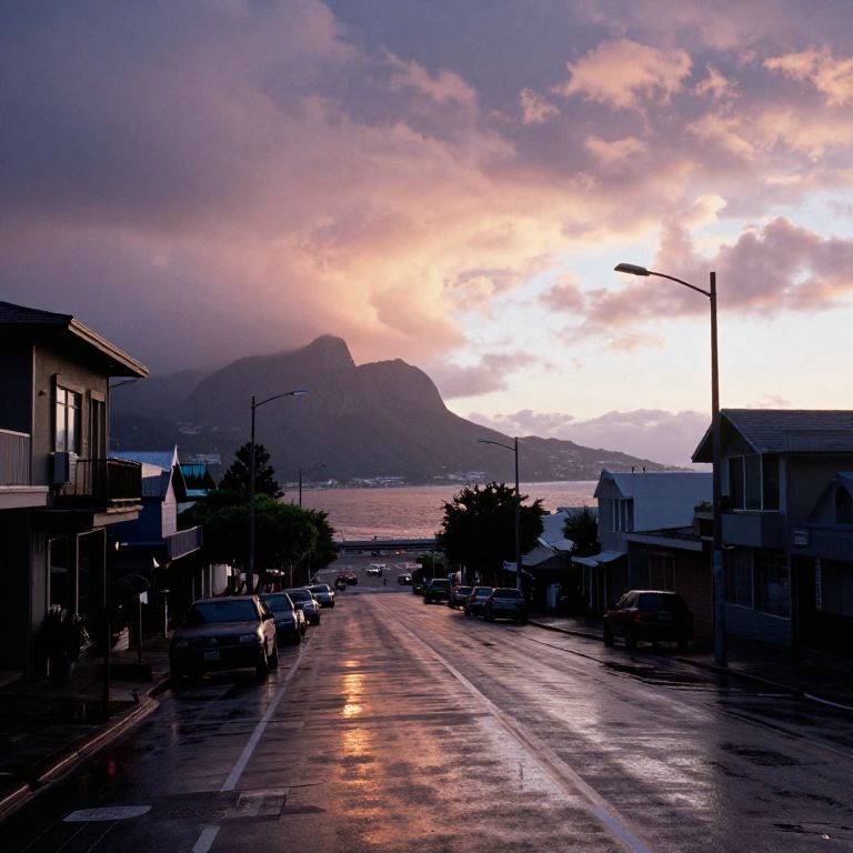 Coarse photograph of a 90’s city street, mountains and ocean cost, fantastic light, after rain, reflexing, low angle, ultracolor, dramatic, sony, 35mm, 32K,