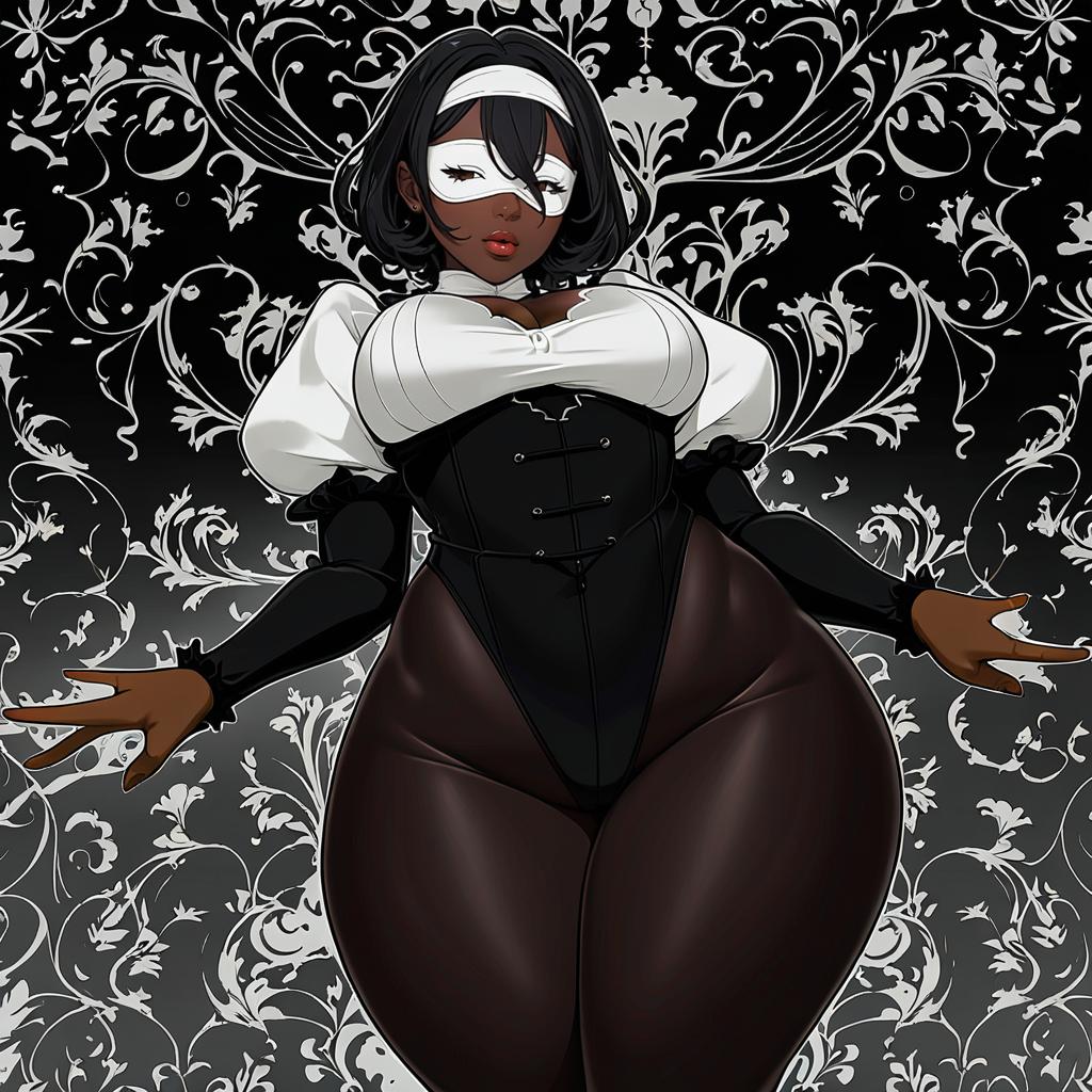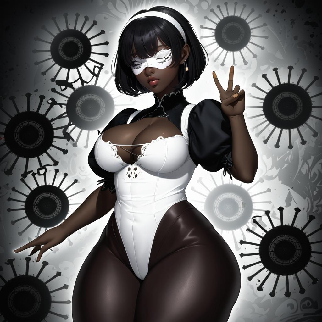 2p (nier:automata), nier (series), 1girl, dark-skinned female, very dark skin, mole under mouth, lips, short hair, black hair, white hairband, large breasts, medium breasts, cleavage, cleavage cutout, thick thighs, ass, thighs, highleg leotard, juliet sleeves, blindfold, white blindfold, by artist michael f91, leet