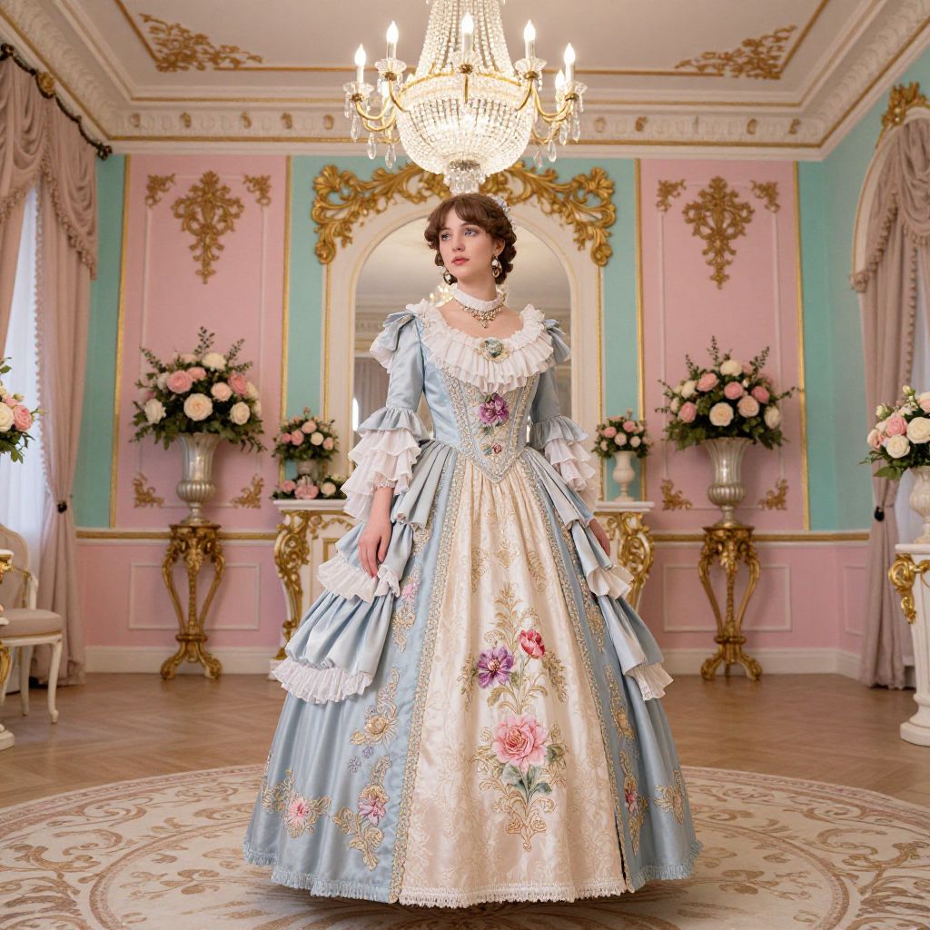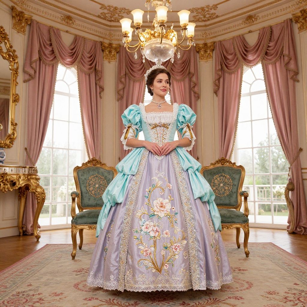 A woman dressed in an elaborate Victorian-style ball gown featuring puffed turquoise sleeves and a pastel lavender skirt adorned with intricate floral embroidery. She is standing in a luxurious room with ornate gold accents, green velvet chairs, and tall arched windows with pink drapery. The setting includes an elegant chandelier and antique furniture, evoking a classic, regal ambiance.