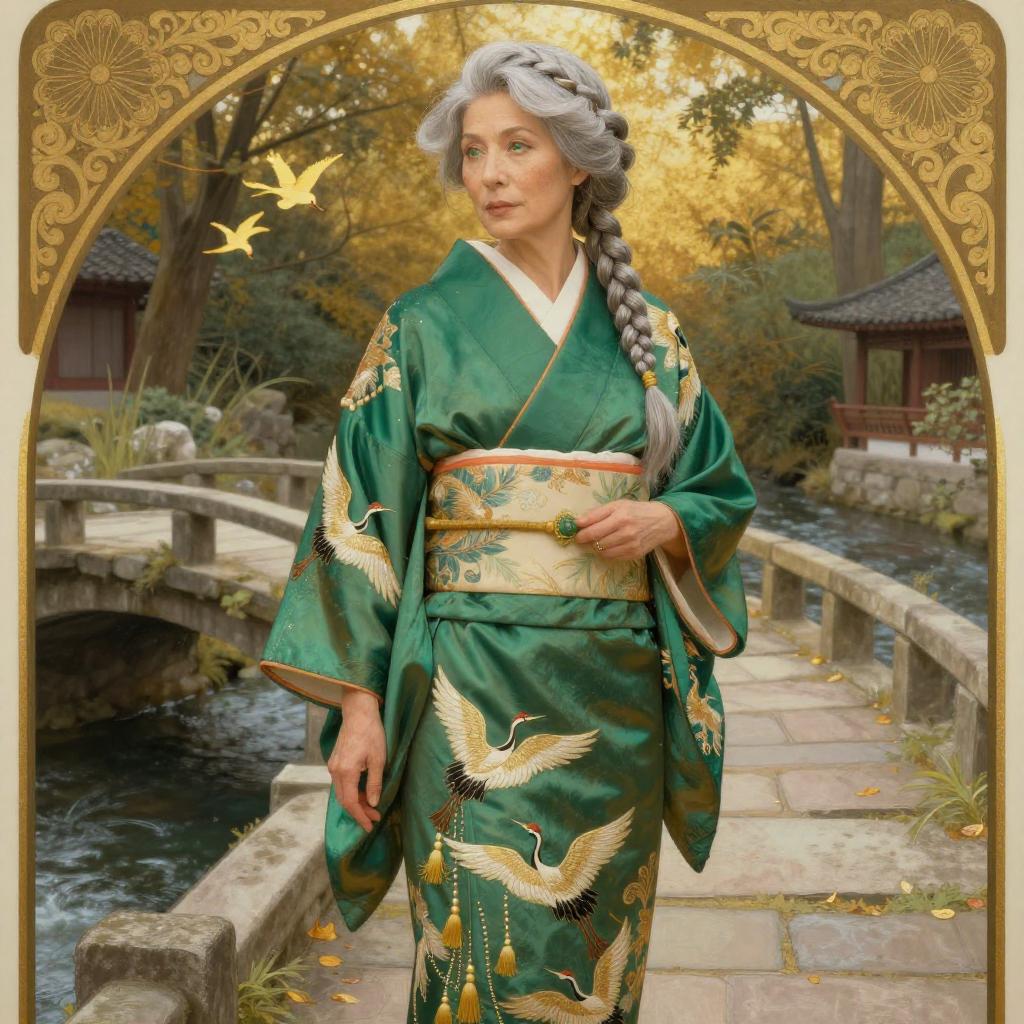 An artistic portrayal of a middle-aged woman with braided silver hair, freckled skin and soulful green eyes dressed in a flowing emerald silk kimono embroidered with gold cranes and trailing tassels, standing on a sunlit ancient stone bridge over a gently flowing creek, rendered in a painterly Art Nouveau illustration with soft glowing filigree, warm golden highlights, and intricate ornamental borders.