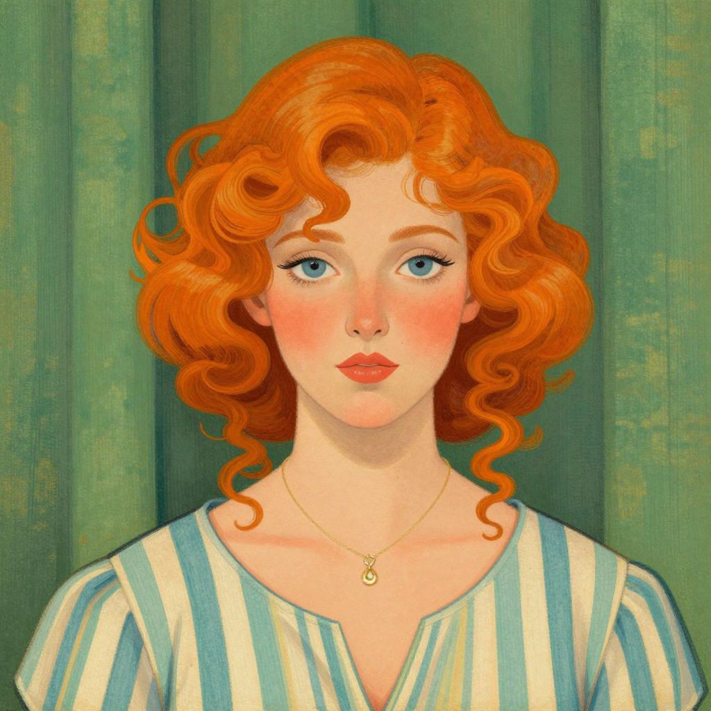 A vibrant digital illustration inspired by the retro aesthetic of Vanessa Bell's \"Self–Portrait (c. 1915),\" featuring a woman with curly orange hair, blue eyes, and rosy cheeks, adorned with a striped blouse and a delicate necklace, set against a textured green curtain backdrop.