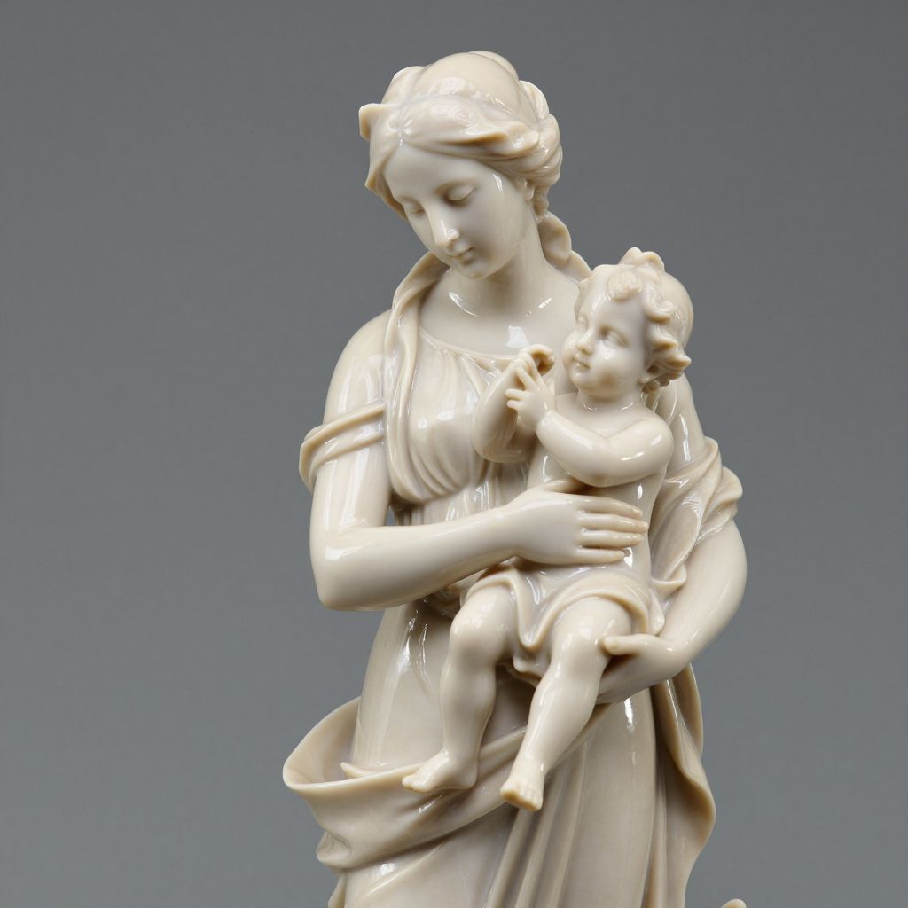 A finely crafted KPM porcelain sculpture in a Rubenesque style depicts a serene woman tenderly holding a cherubic child, showcasing intricate detailing and a soft, creamy finish characteristic of high-quality figurative art.