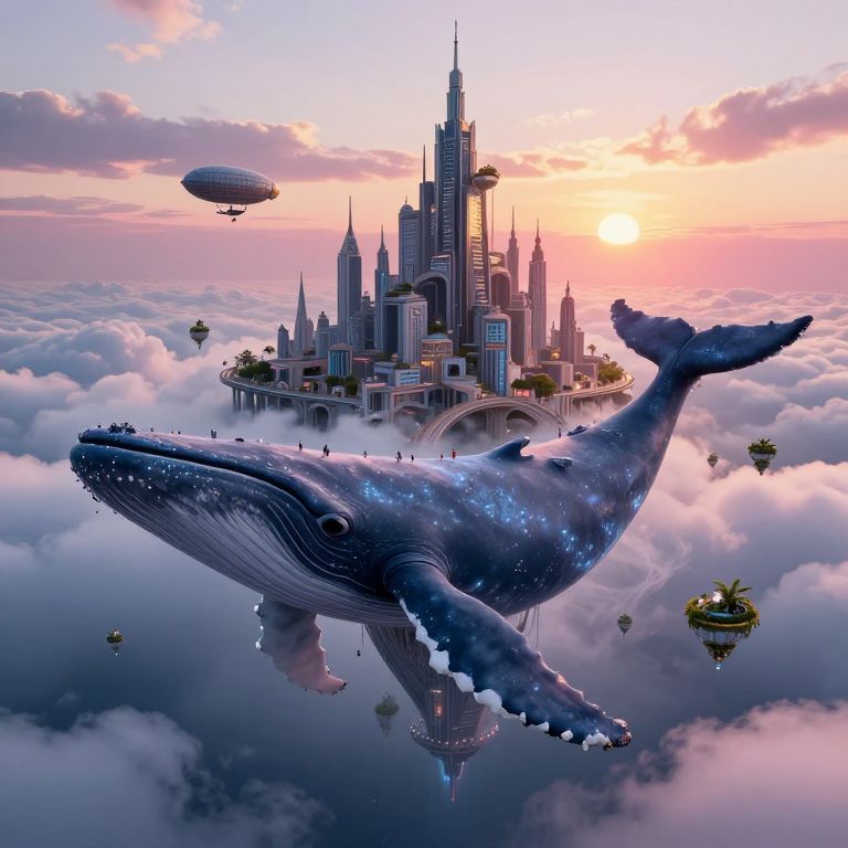 High above the clouds, a sprawling city sits on the back of a massive, floating whale, The whale’s skin glows faintly, rippling with the bioluminescence of a thousand tiny creatures living on its surface, The city itself is a marvel of engineering, with tall spires, bridges, and intricate towers that extend across the whale’s vast back, Airships and flying creatures dart between the buildings, and the people below live in harmony with the whale, tending to gardens that float in the sky and collecting water from the misty clouds, The whale glides gracefully through the air, its slow, rhythmic movements casting a peaceful calm over the city, while above, the sun sets, painting the clouds with hues of pink, gold, and purple