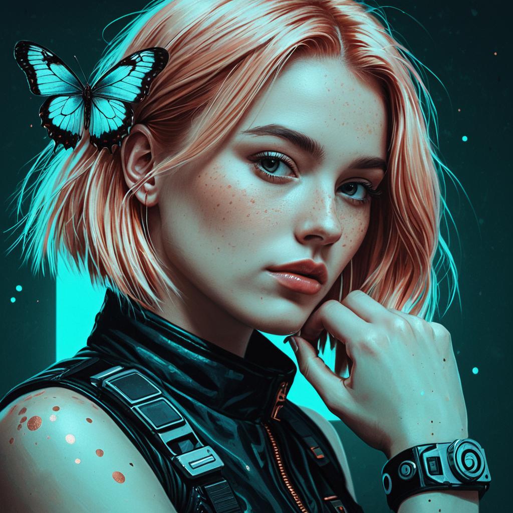 Digital illustration of a young woman with shimmering rose gold hair and soft freckles. She is wearing a sleeveless black top and a rose gold wristwatch with a teal strap. Two animated neon cyan butterflies hover around her against a dark, cyberpunk-inspired teal background with floating specks. The artwork features flat shading and a subtle enhancement for depth, inspired by Gemma Correll's distinctive style.